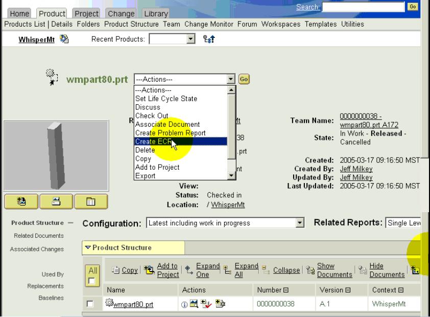 Select "Create Problem Report" or "Create ECR/ECN" from the "Actions" Drop-Down List: |
