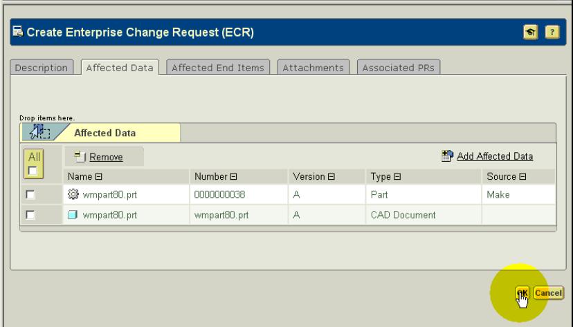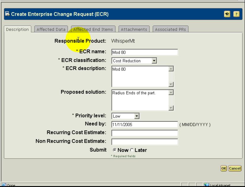 Select "OK" button from the "Create ECR" Page. You can also add other items under the other offered Tabs ("Affected End Items", "Attachments" or "Associated PRs" [Problem Reports]): |