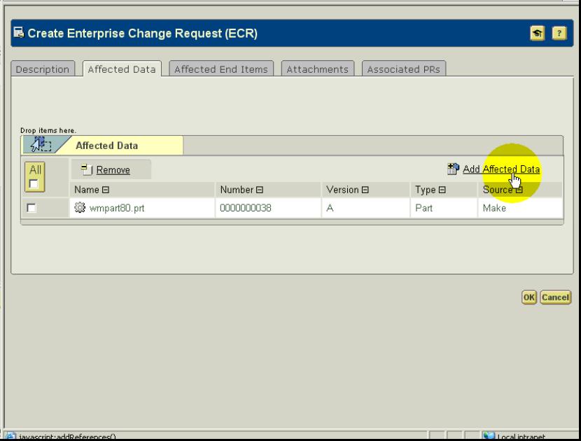 Select "Add Affected Data" link, under "Affected Data" Page (Tab), to add associated prt/asm/drw (Cad Document - Windchill): |