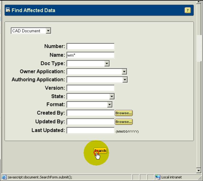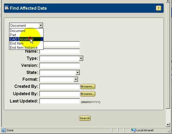 Select "Cad Document" from drop-down in the "Find Affected Data" pop-up page: |